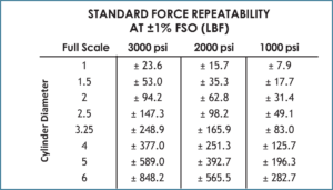 Pressure is measured using a pressure transducer, and the resulting force is calculated based on the cylinder’s effective area. Like any measurement device, pressure transducers have defined accuracy and repeatability limits, which are typically specified as a percentage of full-scale output.
